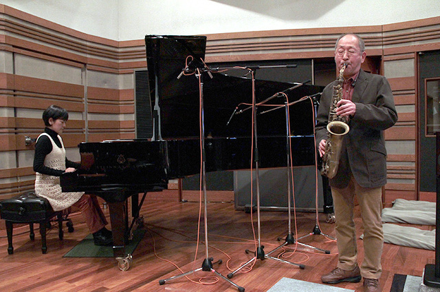 苫米地義久さん(サックス)と石塚まみさん(ピアノ)の生演奏が披露された