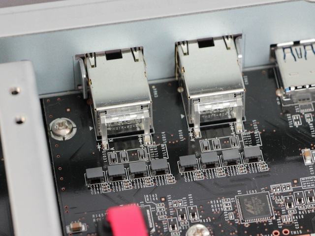 LANポートの手前に4つ並ぶのがTDK製の機械巻きパルストランス
