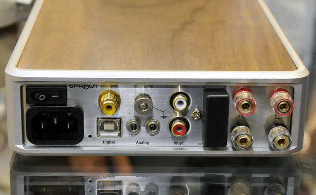 SPROUTのリアパネル。最大192kHz/24bitに対応したUSB(Bタイプ)入力や、フォノイコライザーの搭載が大きな特徴だ