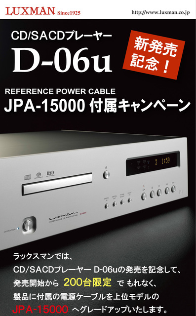 ラックスマン、「D-06u」発売を記念して電源ケーブルをアップグレードするキャンペーン