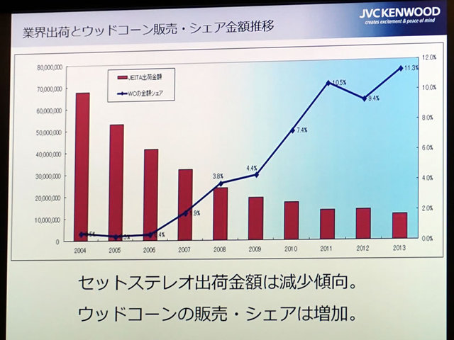 セットステレオ市場全体は減少傾向にあるがウッドコーンの販売・シェアは増加していると紹介