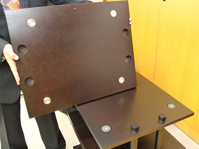 一枚の棚板の上部だけをはずしたところ。二枚の棚板同士はスパイクとプレートでフローティング支持させている
