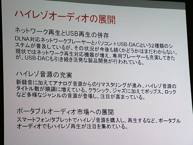 ハイレゾ音源の充実ぶりや、ポータブル市場への展開など、ハイレゾオーディオの現状についても語られた