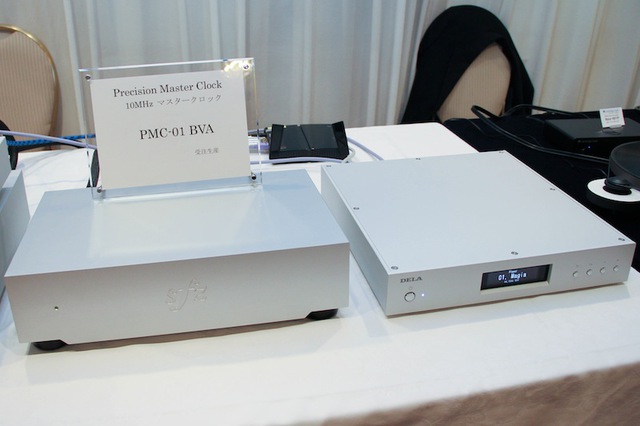 同社製マスタークロック「PMC-01 BVM」を組み合わせてデモ。右はバッファフォーのNAS「N1Z」