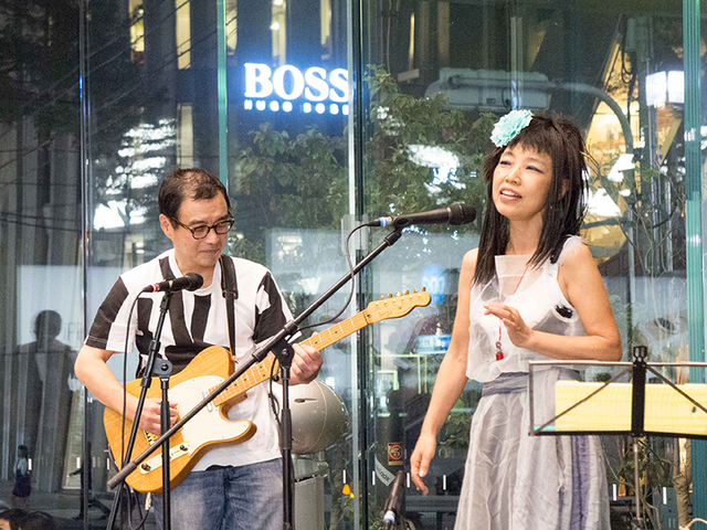 ミニライブではアーティストのおおたか静流氏を迎え、オノセイゲン氏はギターとして登場。彼女の歌声がストア全体を包み込む。