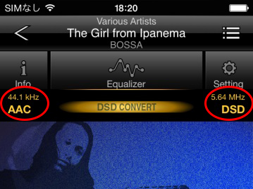 44.1kHz AACを5.6MHz DSDに変換して再生しているところ