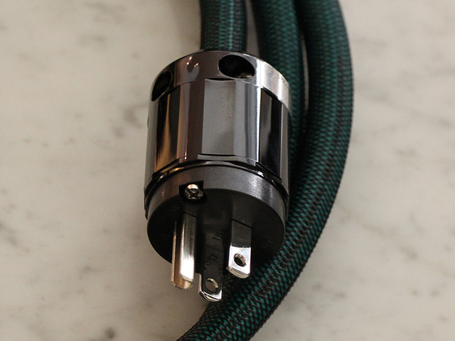 電源プラグ部。「肉圧シルバー+ロジウム」メッキと高比重エンプラ素材、ブレード素材に脱酸リン青銅を採用