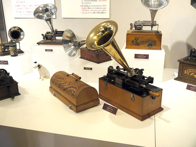 初期の蝋管式蓄音機。ラッパ状の集音機で集めた音を針から蝋管に記録し、またそれを再生する仕組みも紹介される