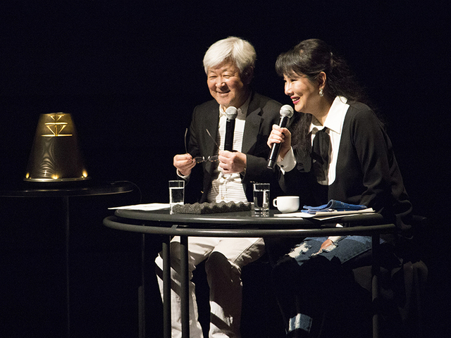 トーク中の様子。左はナビゲーター役の和田博巳氏。写真にも写っていますが、客席のテーブル1つ1つにヤマハのライト一体型Bluetoothスピーカー「Relit」が設置されていました