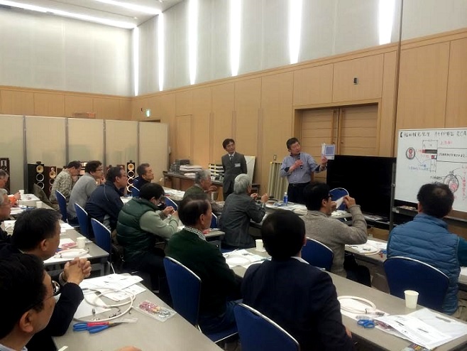 オヤイデ電気によるRCAケーブル製作会の模様。福田雅光氏を講師に迎え、オヤイデ電気スタッフのサポートのもと、参加者全員が完成させた