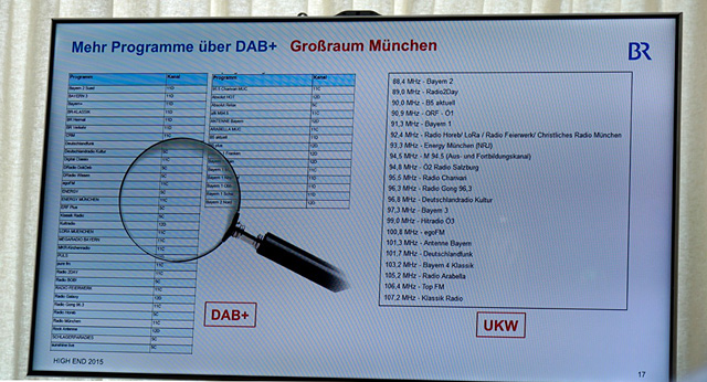 ミュンヘンで受信可能なラジオ放送局の一覧。左側がデジタルラジオ、右側がFM放送。