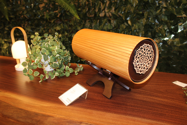 ログハウスのように天然ヒノキ材が巻き上げられているスピーカー「山小屋」。50台限定販売。120,000円(税抜)
