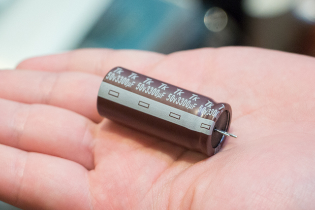 パワーアンプ用のスイッチング電源に採用されたカスタムコンデンサー。6種類の試作の中から選ばれた