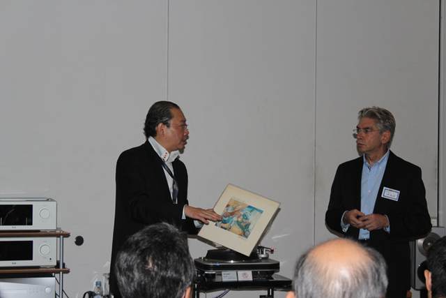 Spiral Grooveの社長であるアラン・パーキンスも来場し、アナログプレーヤーとアクセサリーにかける思いを語ってくれた。左はクオリアジャパンの藤井社長