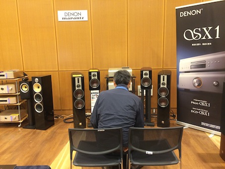 デノンのブースでは熱心に聴き込んでいるお客様が。デノンでは銘機賞銀賞受賞のSX1シリーズとSX11シリーズにDALIのEPICON6と2を組み合わせていた