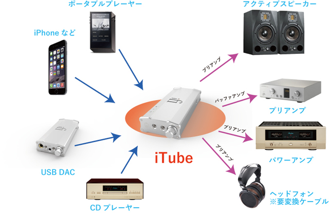 iTubeの主な活用例。プリアンプとしてアクティブスピーカーやパワーアンプに直結できるほか、変換ケーブルがあればヘッドフォンの駆動も可能。すでにオーディオシステムを組んでいる人でも、バッファアンプとして使用できるのは魅力的。プリ-パワーやプレーヤー-プリなど、自分の好きな場所に挿入することで、魅力的なサウンドを獲得することができる