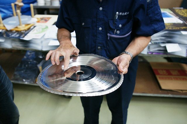 プレスマシンに装着されるスタンパー。カッティングで制作されたラッカーマスターからメタルマスター、マザーを経てスタンパーができあがる