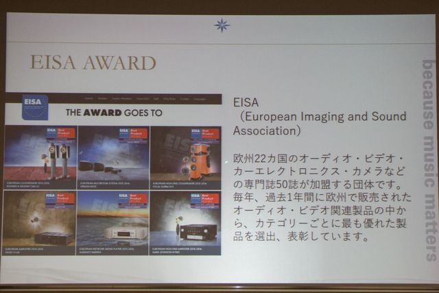 EISAアワードは、欧州22カ国のオーディオ/ビデオ/カーエレクトロニクス/カメラなどの専門誌50誌が加盟する団体 EISAによるアワードとなる