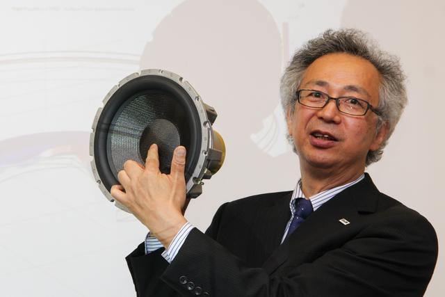 ウーファーユニットについて説明する澤田氏。新旧のユニットのセンターキャップを叩いて、その強度を示すデモも行った