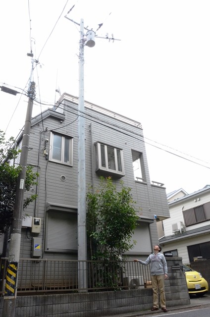 田中伊佐資氏と取材先の「マイ柱」。『季刊オーディオアクセサリー163』号では、6人のマイ柱ユーザーの生の声など、気になるマイ柱の最新情報を特集記事として掲載