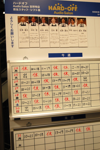 新潟紫竹山店同様に、スタッフのシフト表が貼り出されているのもオーディオサロンの特徴。スタッフとの信頼関係を構築できるのもオーディオサロンならでは