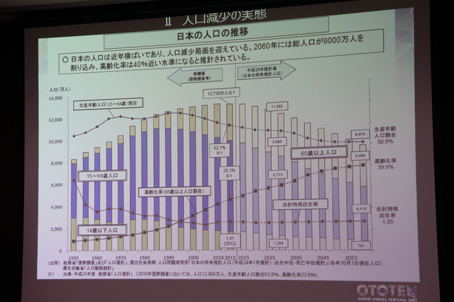 人口減少の実体を紹介しつつ、オーディオのおけるイノベーションの必要性を説いた