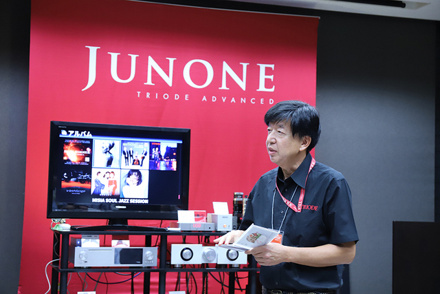 昨年の東京インターナショナルオーディオショウでCOCKTAIL AUDIOのデモを行うトライオード山崎社長