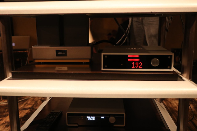 中段は、ARAILabのMC昇圧トランス「MT-1」(左)と、今回の試聴の肝となるM2TECHのフォノイコ機能付ADコンバーター「Joplin MKU」(右)。下段には、M2TECHのDAC/プリアンプ「YOUNG MKV」