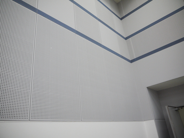 壁に有孔ボードが採用され、天井の高い室内環境。心地よい音が響いた