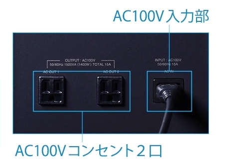 出力端子のAC100V三極アースつきコンセント2口と、充電用の入力端子(本機の充電にはアースつきコンセントが必要)。ほかに太陽光パネルから直接充電できる端子も装備