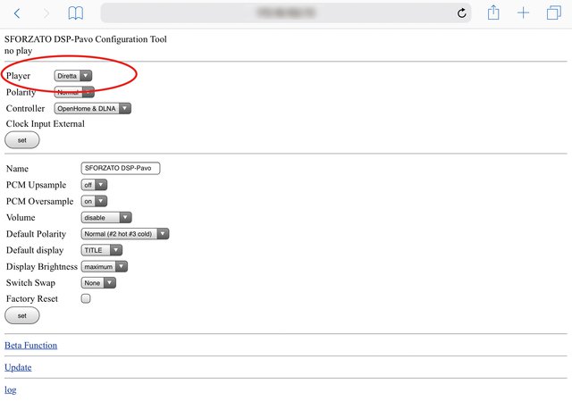 スフォルツァートのconfig画面。Playerの項目を「Diretta」に設定する