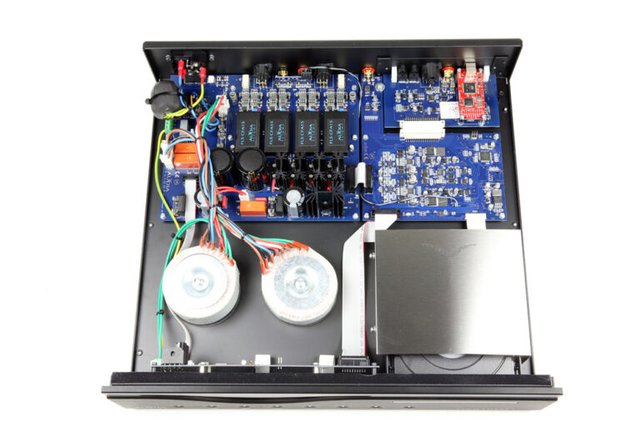 FLCD THREE Sの内部。手前が正面で、右手にディスクドライブ、左手に巨大な電源トランスを装備する