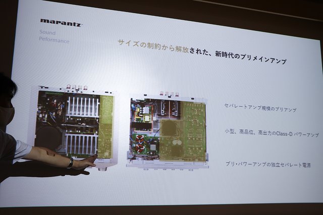 尾形氏が指差す黄色の部分がプリアンプの使用容積。PM-12(左)と比べて大幅に増えていることがわかる