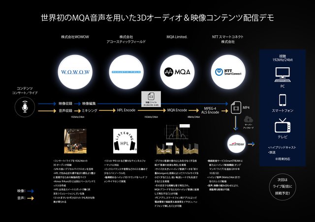 今回の公開実験には、WOWOWとMQAのほか、HPLを開発するアコースティックラボ、配信を担当するNTTスマートコネクトが参加した