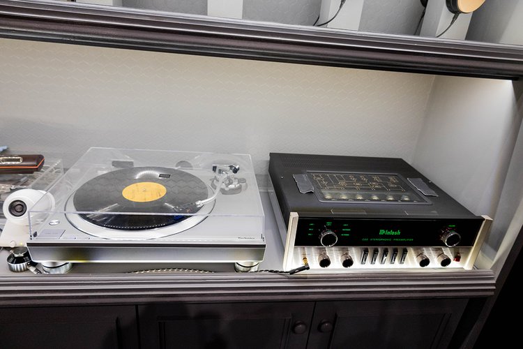 レコード再生はテクニクスのアナログプレーヤーから。小型スピーカーで店内にも音楽が流れている