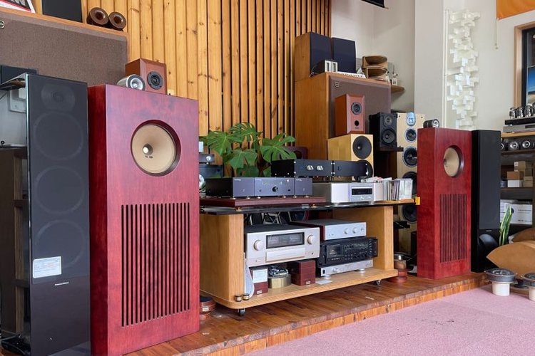 内側の茶色のスピーカーはSymPhomagiのオリジナル。ヴィンテージ(GRUNDIG社)の20cmワイドレンジにウーファーとトゥイーターを追加した3ウェイの後面開放型。ヴィンテージの良さを生かしてワイドレンジ化したシステムだそうだ。お客様の要望に合わせたカスタムにも対応する