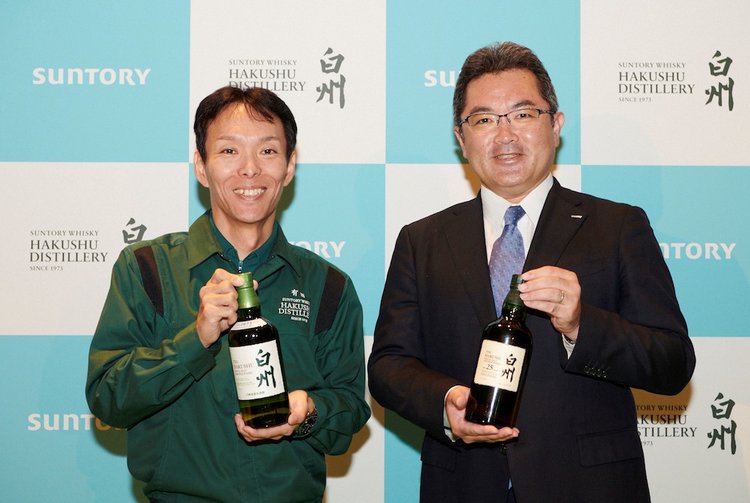 取材会で説明を行ったサントリー株式会社 常務執行役員・原酒開発生産本部長の栗原勝範氏(右)と白州蒸溜所 工場長の有田哲也氏(左)