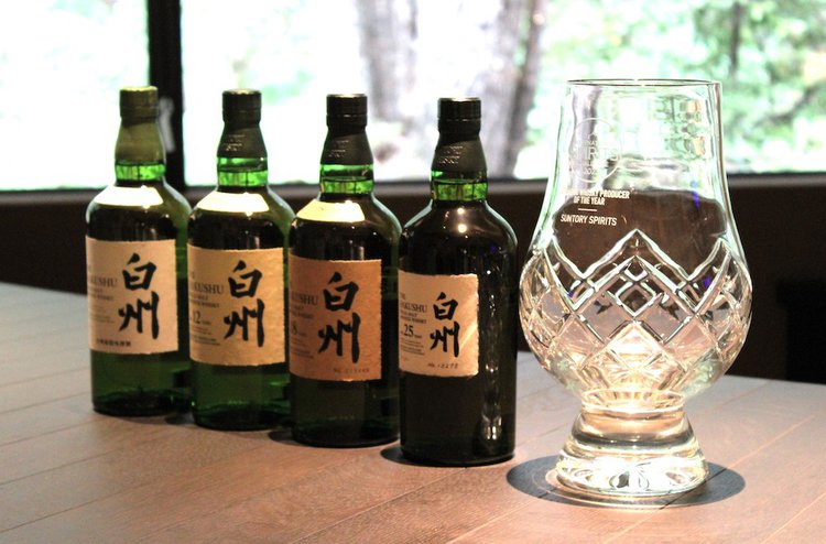 シングルモルトウイスキー「白州」のラインアップとISCで受賞した「プロデューサー オブ ザ イヤー」のグラス