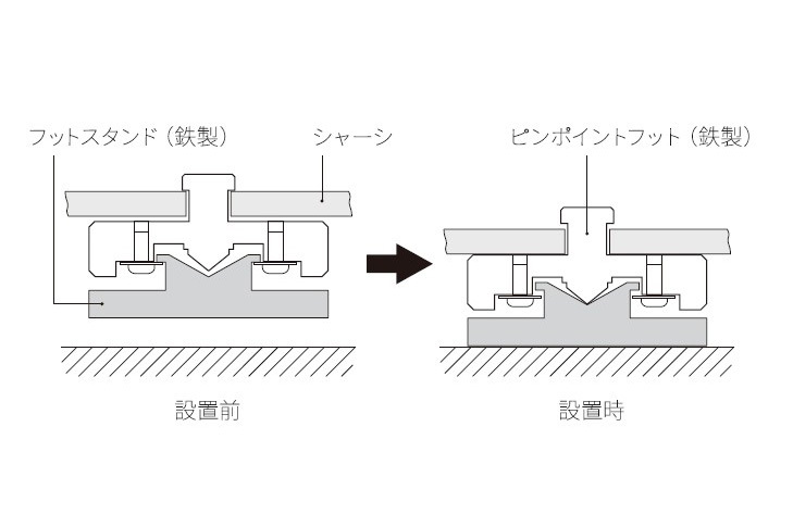 独自の「ピンポイントフット」は、ボトムシャーシにねじ止めしない新構造に