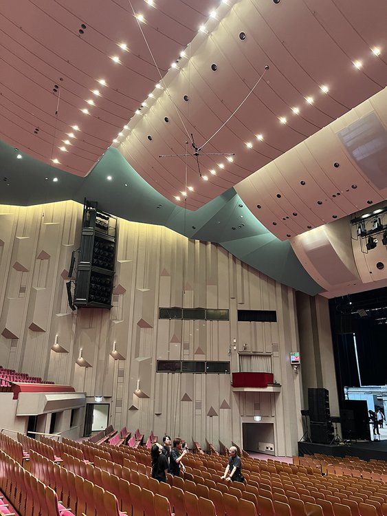 客席の中央真上にはオムニクロス方式のマイクと、客席前後左右に4本のマイクを吊っている