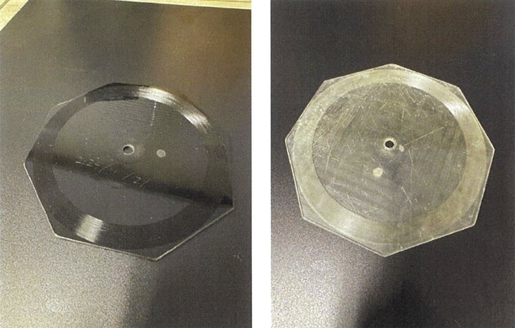 左がAES樹脂盤、右がAS樹脂盤。さまざまなサンプルを試作し針が「うまく滑る」素材を検討した
