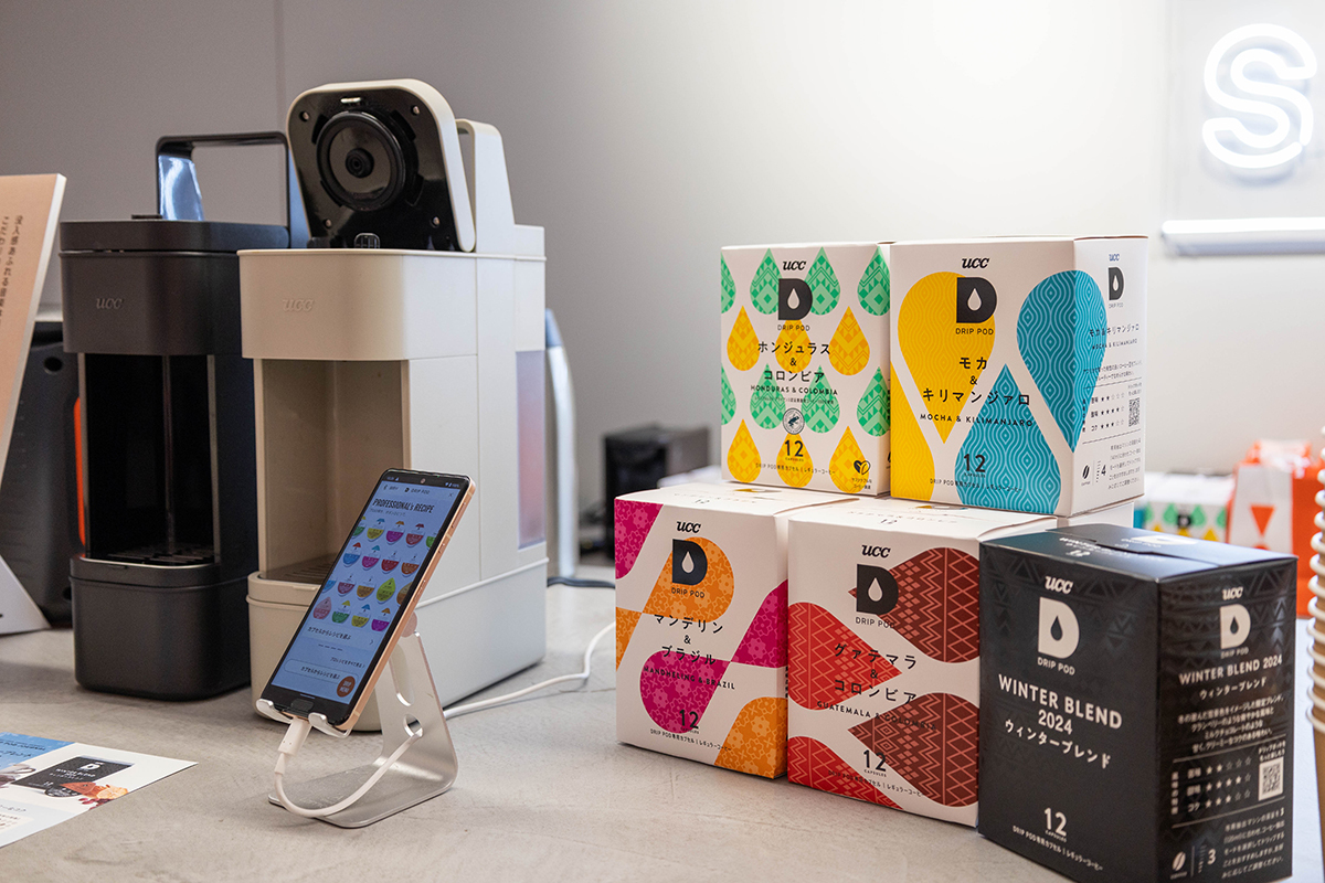 カプセル式のコーヒーメーカー「DRIP POD YOUBI」で淹れたてのコーヒーを味わえる。右は各種用意されているコーヒーカプセル