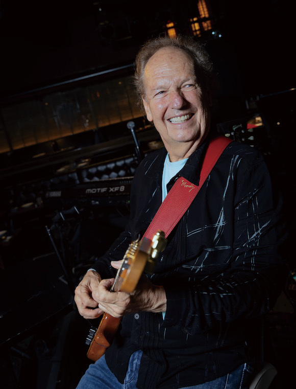 70歳を超えてなお若々しく爽やかなリー・リトナー。ライブ前、ギターを爪弾きながらインタビューに応じてくれた