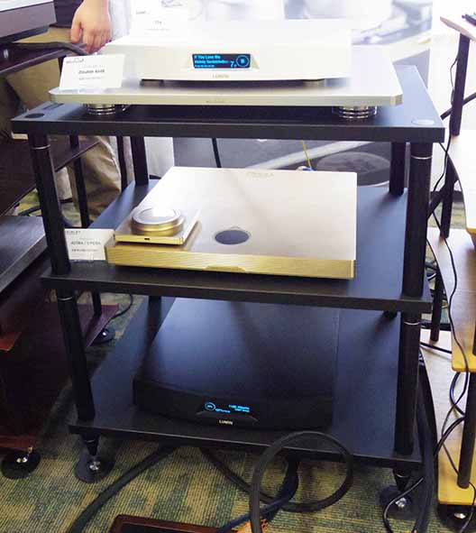 完実電気はLUMINのネットワークプレーヤー「T3X」やDEVIALETのプリメインアンプ「Astra」、Perfectionの電源ボックス等を使用したデモを実施。写真のラックは近日発売予定のEssenza by Bassocontinuoの製品