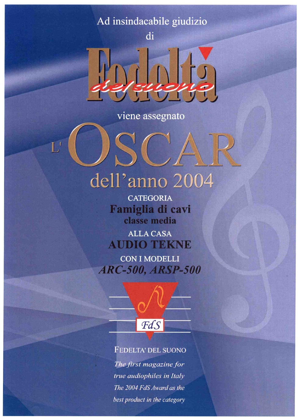 『Fedelta』誌受賞の認定書