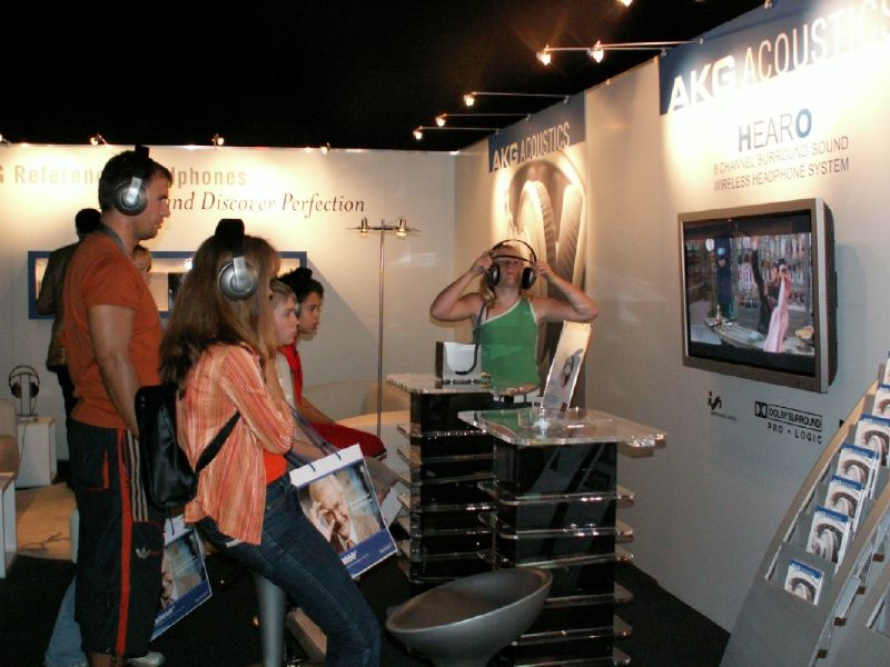 AKGのサラウンドヘッドホンの体験コーナーは人気を集めていた