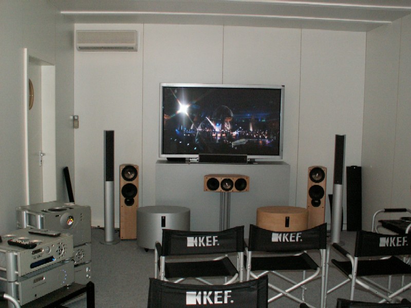 KEFの視聴ルーム。いくつかの種類のスピーカーが並べられている
