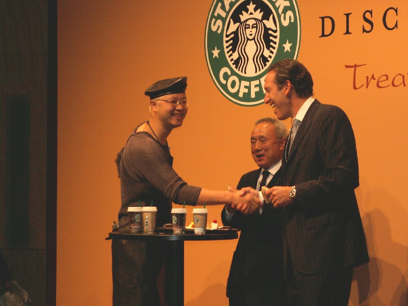パーティでオリジナルスウィーツを披露した辻口博啓氏(右)。中央はスターバックス コーヒー ジャパンの代表取締役 角田雄二氏
