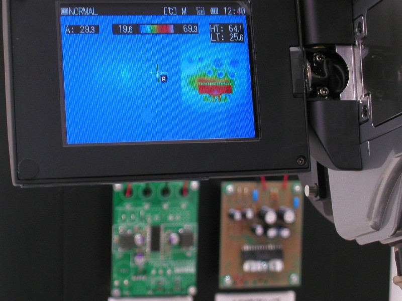 ロームのPWMアンプ展示。同一の出力を持つAB級増幅のICと並べ、同一のパワーを出力させた時の発熱量の差を赤外線感知で表示。右のAB級が大きく発熱しているのに比べ、左のPWMはほぼ熱を発生していない