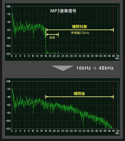 ビットレボリューションの高域補間イメージ。MP3は16kHz程度、CDは22kHz低後以上がカットされているが、それらを48kHzまで補間する